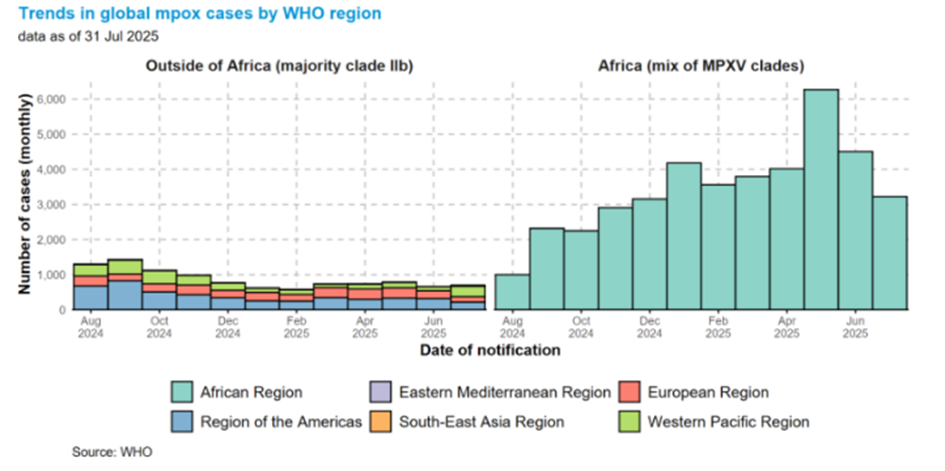 Batı Pasifik ve Güneydoğu Asya bölgeleri, Temmuz 2025'te Haziran 2025'e kıyasla vaka sayılarında aylık bir artış bildirmiştir; sırasıyla %160 (116'dan 297'ye) ve %5,9 (17'den 18'e) artışlar kaydedilmiştir. Batı Pasifik'teki doğrulanmış vakalardaki aylık artış, Filipinler'deki (Haziran ayında doğrulanmamış vaka sayısından Temmuz ayında 126 doğrulanmış vaka sayısına) ve Çin'deki (108'den 152 doğrulanmış vaka sayısına) vaka sayılarındaki artıştan kaynaklanmıştır.