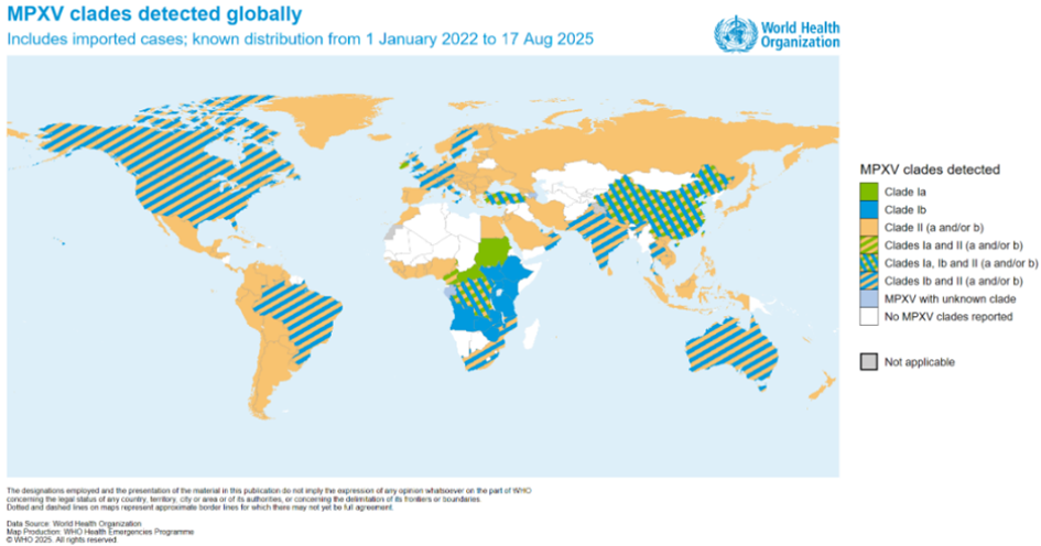 Şekil 1. 1 Ocak 2022 - 17 Ağustos 2025 tarihleri arasında DSÖ'ye bildirilen MPXV sınıflarının ülkelere göre coğrafi dağılımı(1).
