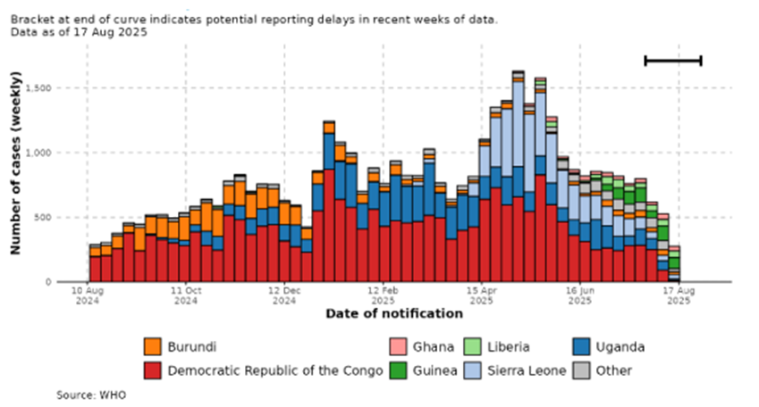 - Kenya, toplum içi bulaşma yaşamaya devam etmekte ve 2025 yılı boyunca bildirilen doğrulanmış vakalarda kademeli bir artış eğilimi gözlemlemektedir. Vakalar öncelikle genç yetişkinler arasında bildirilmeye devam etmekte ve bir ölüm hariç tüm ölümler HIV ile yaşayan kişiler arasında bildirilmiştir.