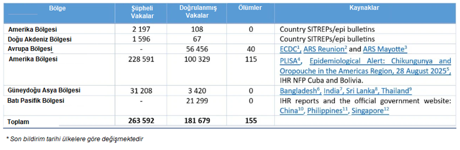 Ocak-Eylül 2025 arasında mevcut verilere göre, dünya genelinde 263.592 şüpheli ve 181.679 doğrulanmış CHIKV hastalığı vakası ve 155 CHIKV hastalığına bağlı ölüm bildirilmiştir. Bazı DSÖ bölgeleri 2024'e kıyasla daha düşük vaka sayıları bildirirken, diğerleri belirgin artışlar yaşamaktadır. Bölgesel eğilimlerdeki bu heterojenlik, küresel artışın yorumlanmasını zorlaştırmaktadır. Bunun yerine, veriler belirli coğrafi bölgelerde yerel düzeyde yeniden ortaya çıkma veya ortaya çıkma olduğunu göstermektedir. Amerika kıtası en yüksek vaka sayısını bildirmiş, onu Avrupa bölgesi (ağırlıklı olarak Hint Okyanusu'ndaki Fransız Denizaşırı Departmanlarından bildirilen vakalardan oluşmaktadır) izlemiştir.